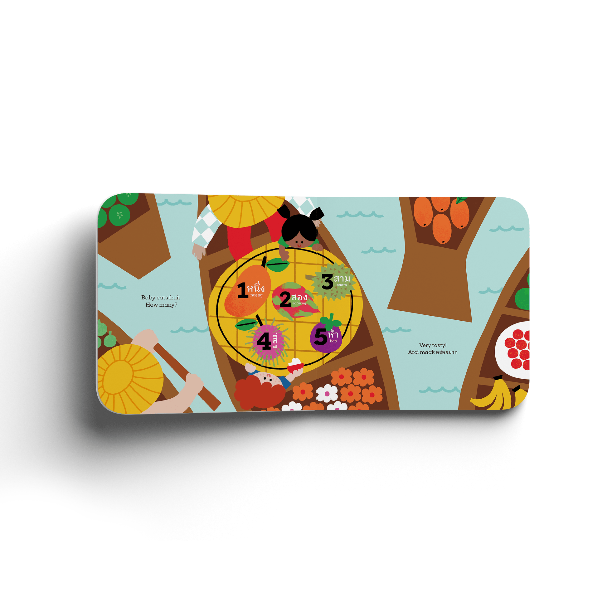 Baby Go! Thailand explores colors, shapes, sounds and sensory experiences through travel. From smelling flowers at the market to counting fruits to splashing at a water festival, baby discovers the local culture and traditions of Thailand.