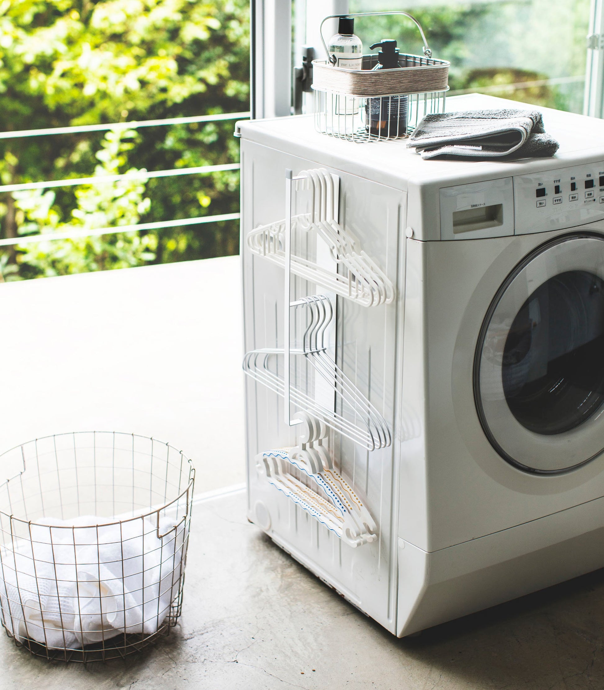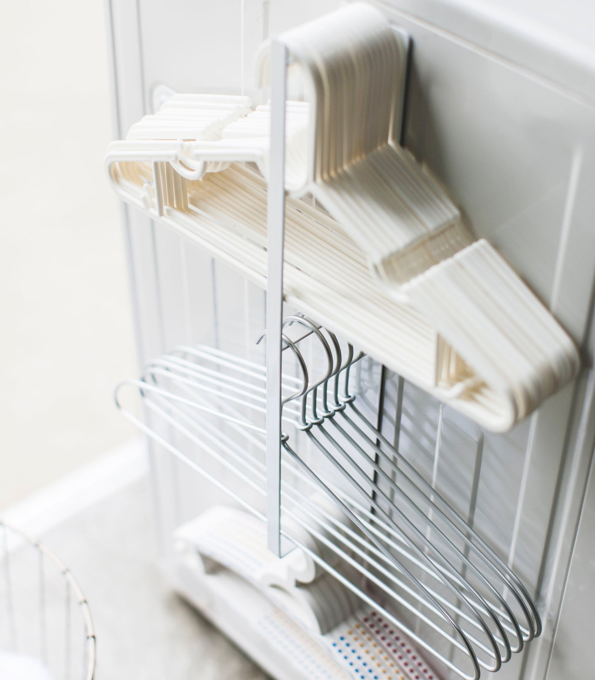 Let your hangers hang out. Imagine you’re ferrying an armload of hangers to the dryer … Where do you put them? Try this simple magnetic hanging solution for your empty clothes hangers. You’ll be able to pluck your warm clothes out of the dryer and grab a hanger from this organizer easily and conveniently.