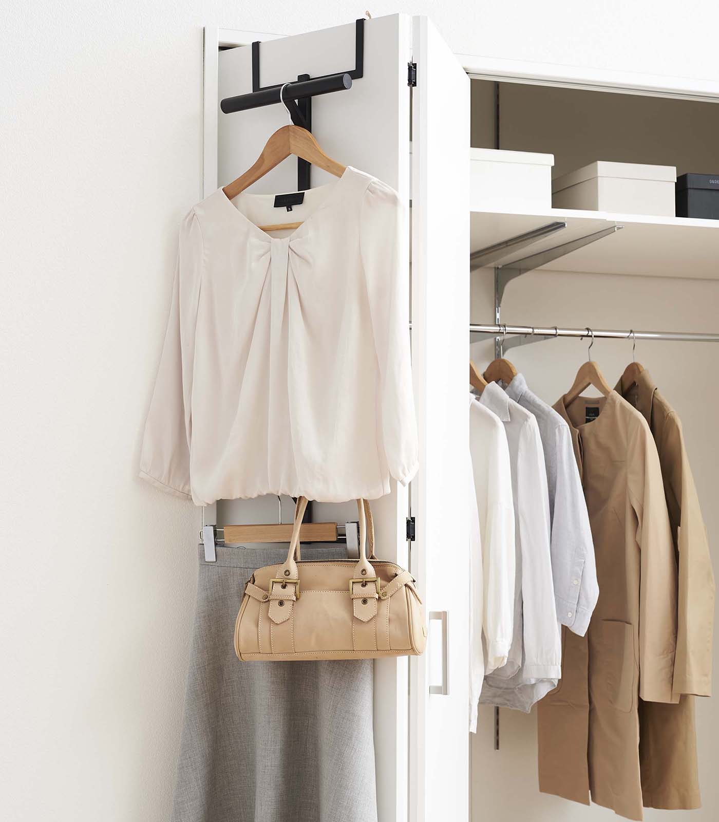 The hanger that’s got your back. Gone are the days of backpacks being strewn all over the floor! Eliminate the tripping hazard by attaching this hanger to any closet or bedroom door to serve as a designated holder for bulky bags and backpacks. The two levels allow extra storage for another backpack, or perhaps for your purses, totes, or even clothing pieces. The hook fits doors up to 1.4" thick. Please be sure to measure your door before purchase.
