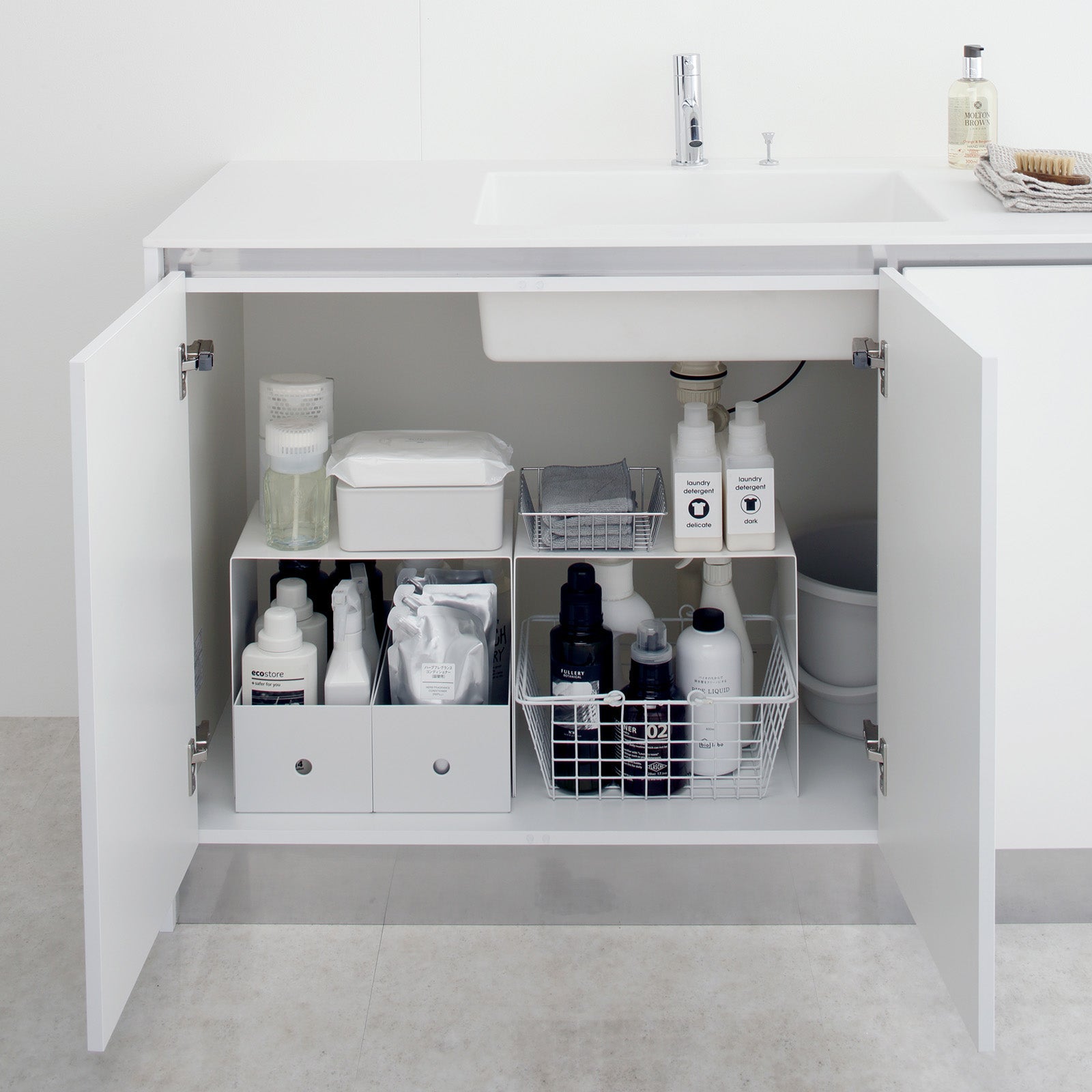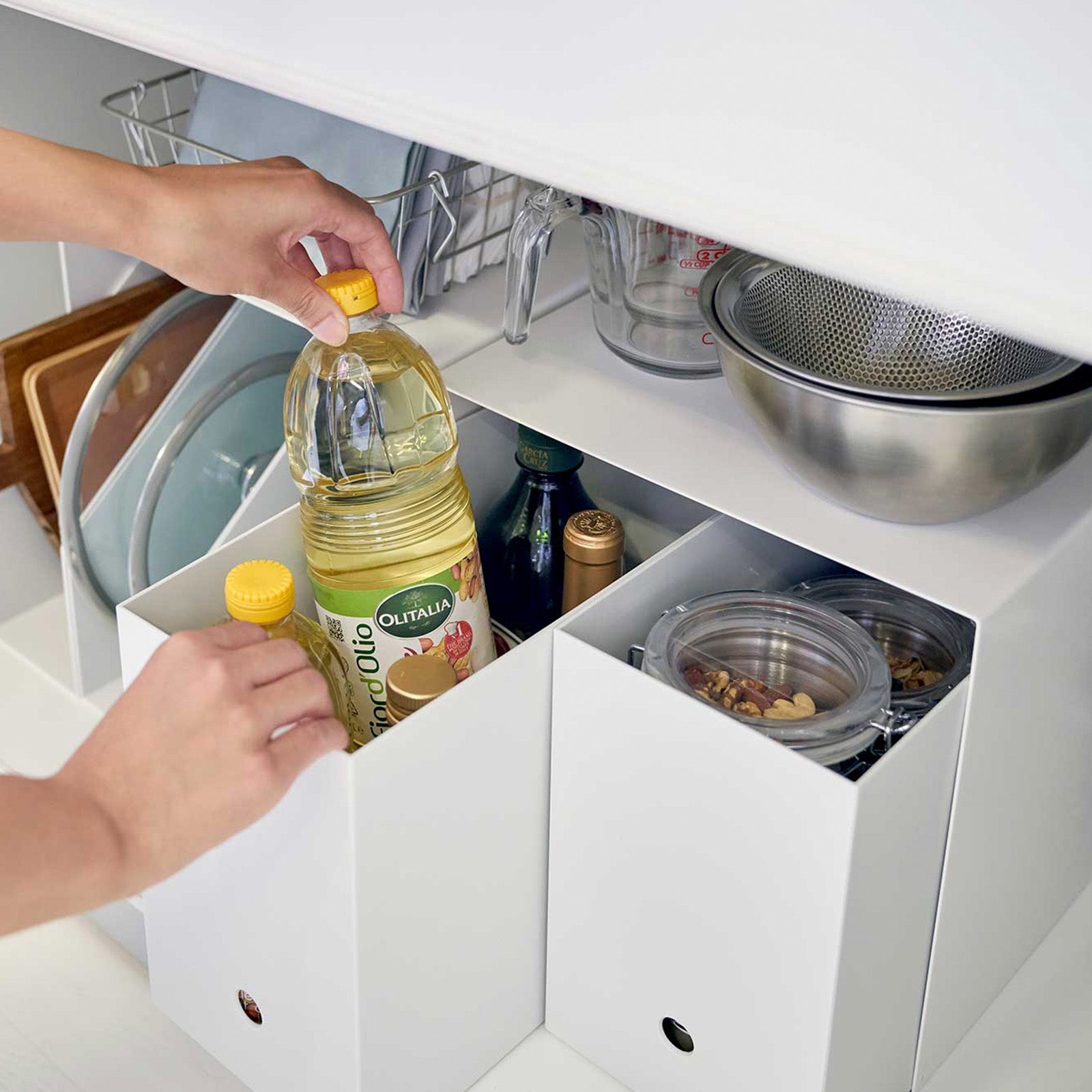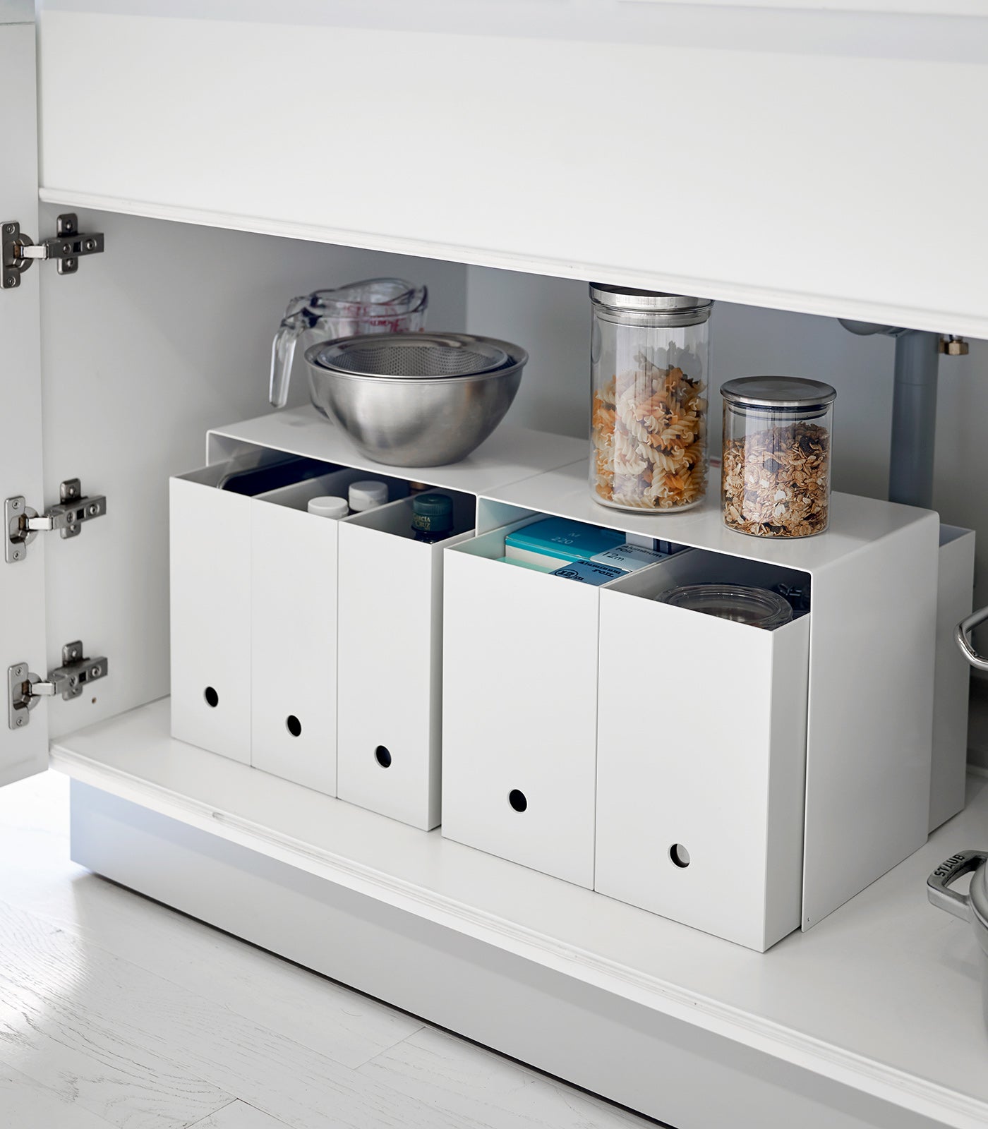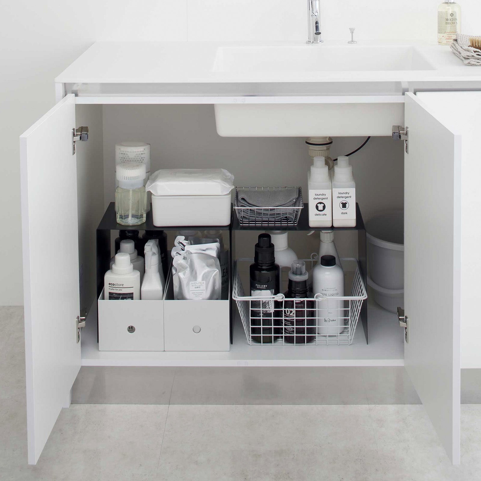 A step up. Introducing an extra-tall version of our super-popular, handy-dandy dish risers. In taller cabinets, space is lost to large pots and pans, which are impossible to stack. This kitchen rack creates a shelf above the pots and pans, reclaiming all that extra space and doubling pot and pan storage potential. We also recommend trying them under the sink to tidy cleaning supplies and other knick knacks.