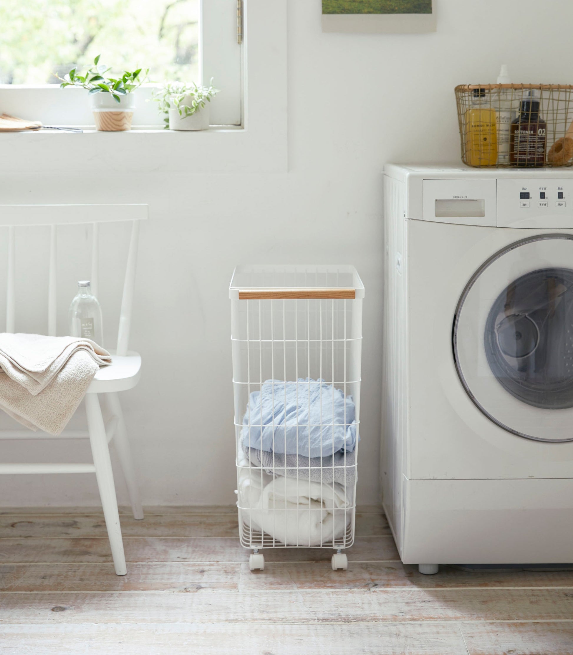 Roly-poly laundry. Scoot your laundry from one destination to the next with this tall wire laundry hamper, complete with a handle and its very own set of wheels. The deep frame accommodates almost twice as much laundry as our largest dual-handled laundry basket. With no liner you have to worry about keeping clean, and a lightweight design for easy mobility, it gives your laundry routine just the lift it needs. Use multiples to keep laundry sorted and organized for laundry day.