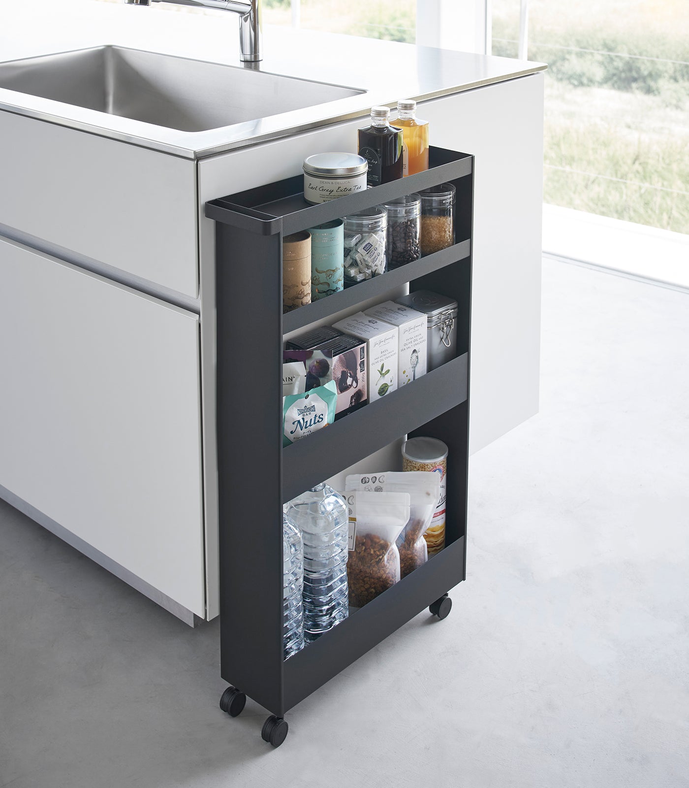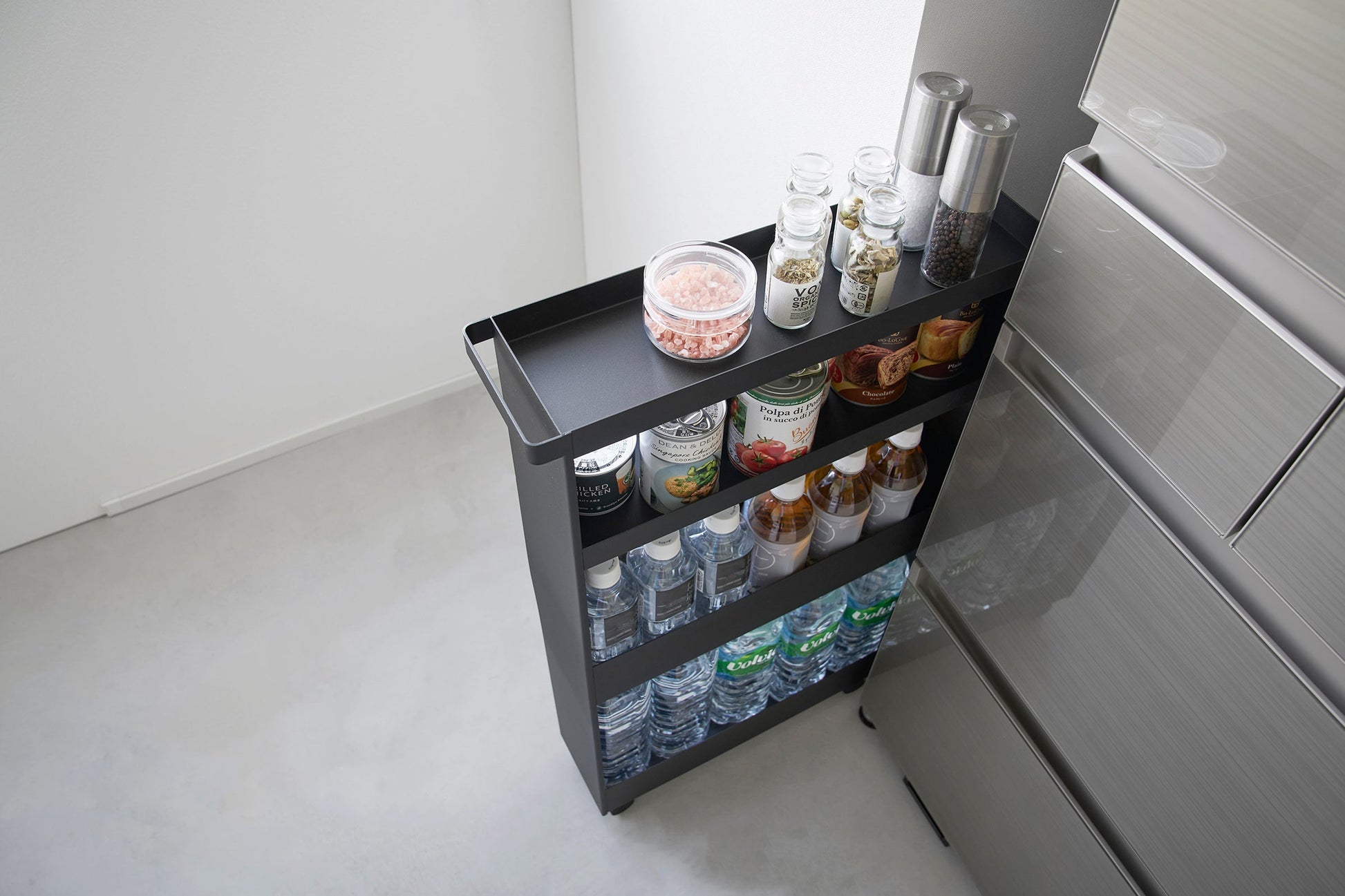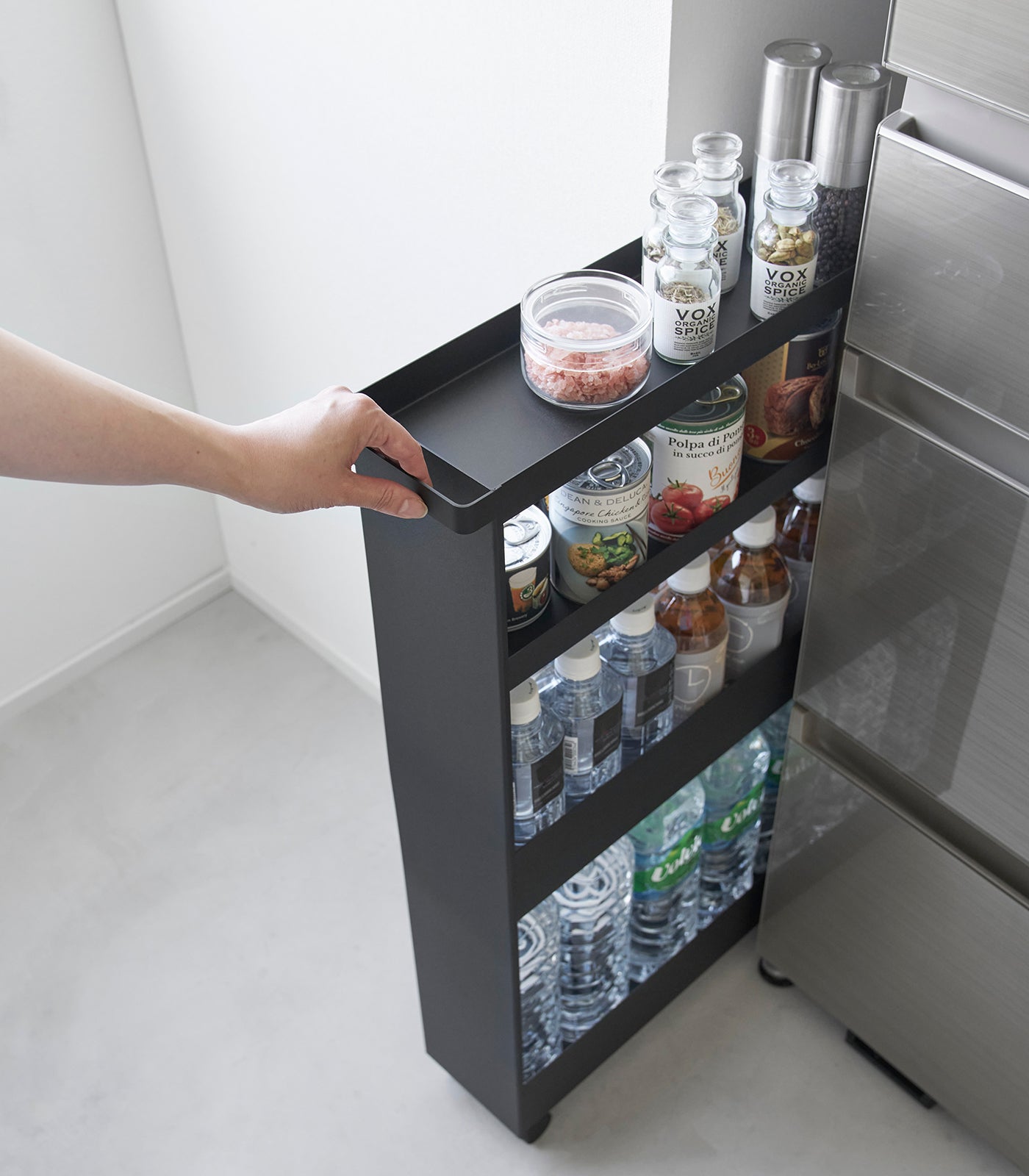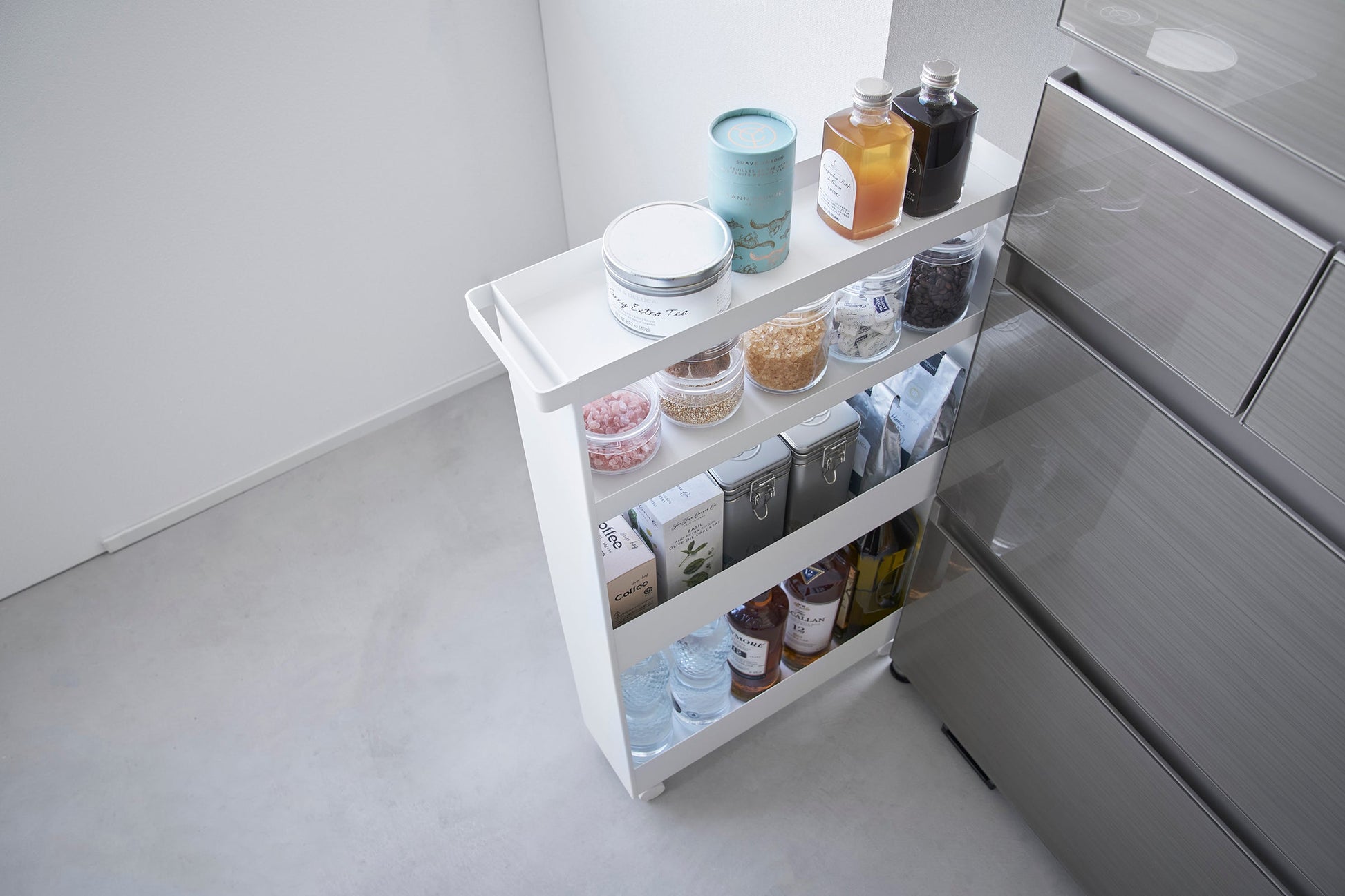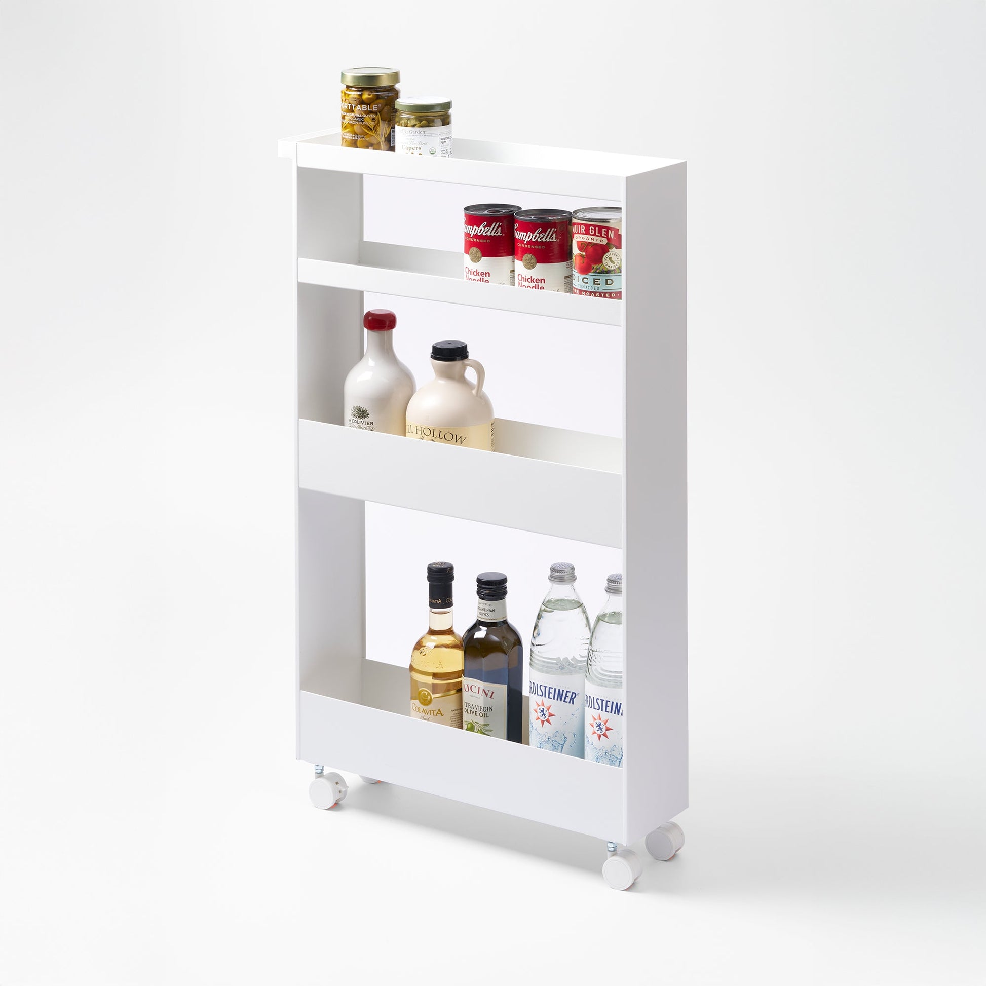 Sliding storage, wherever you need it. Keep this four-tiered rolling storage cart stocked with spices, accessories, cleaning supplies, miscellanious trinkets and more. Turn previously unusable space in your kitchen, bathroom, or living room into an ultra-accessible cabinet. Store heavy objects on the roomy bottom shelf and smaller items on top. Designed with handles and casters, this rack is easy to access, move, and clean. This simple storage solution makes organizing small spaces and large a breeze.