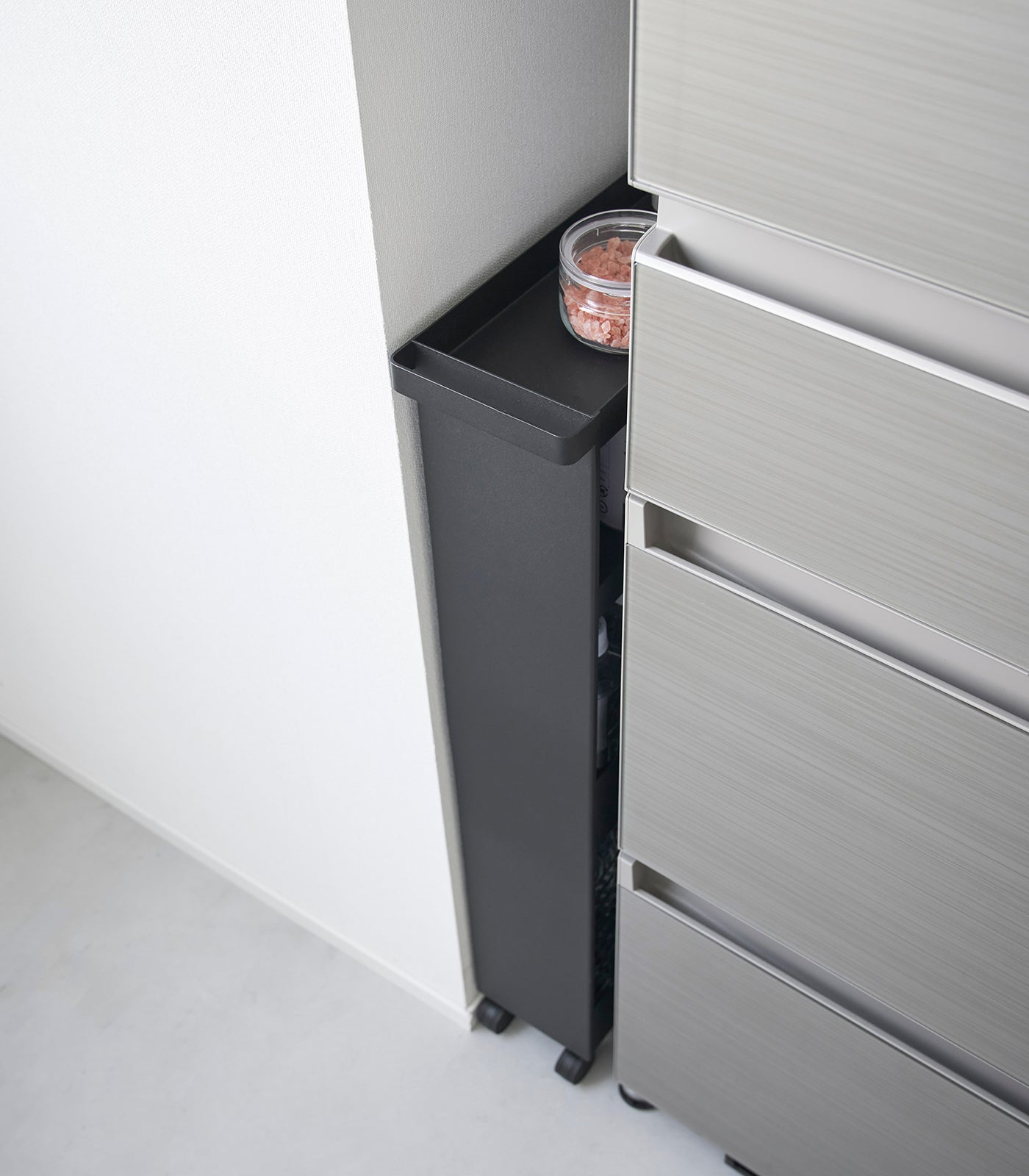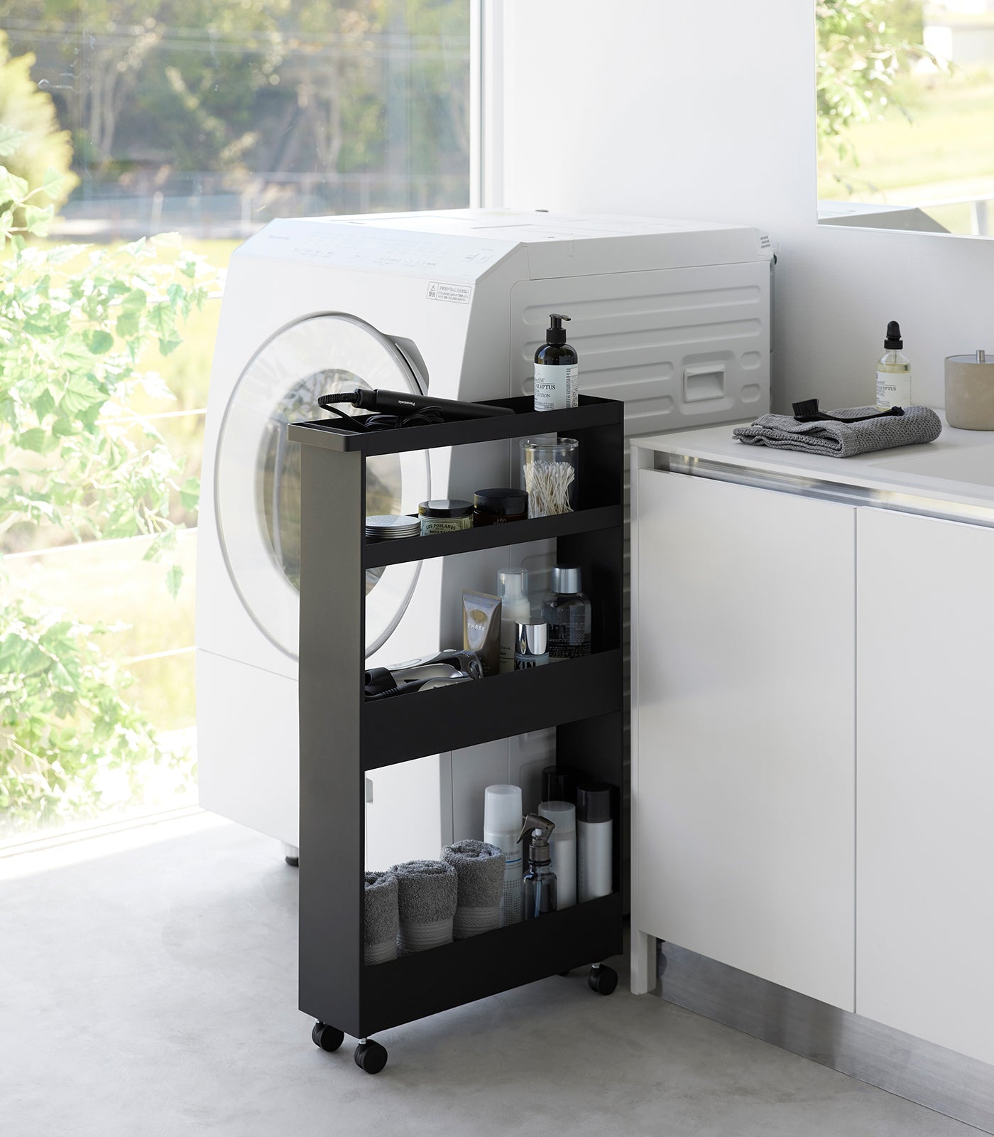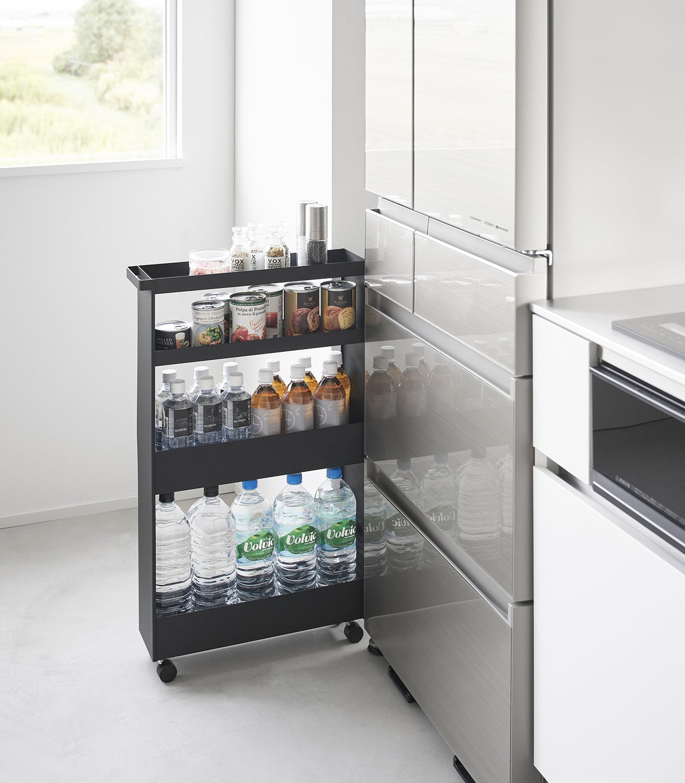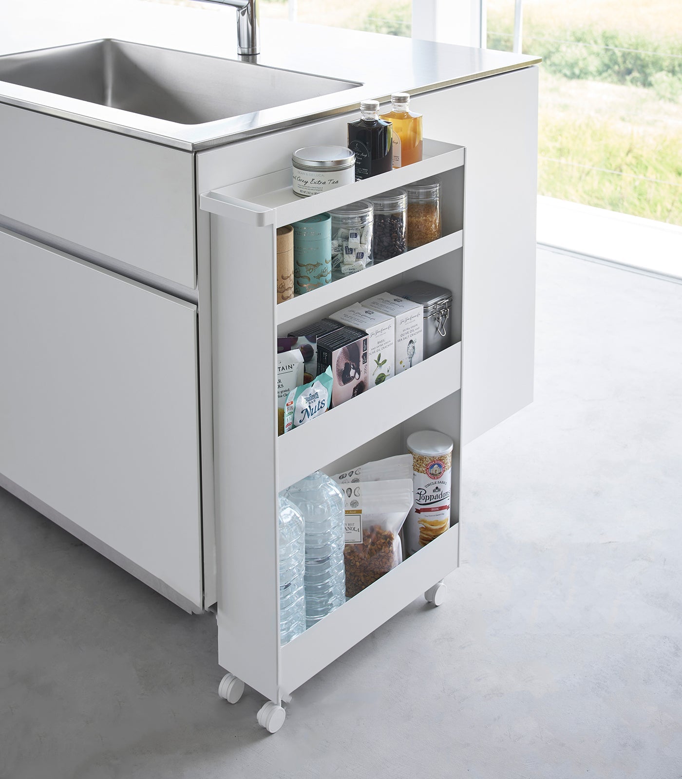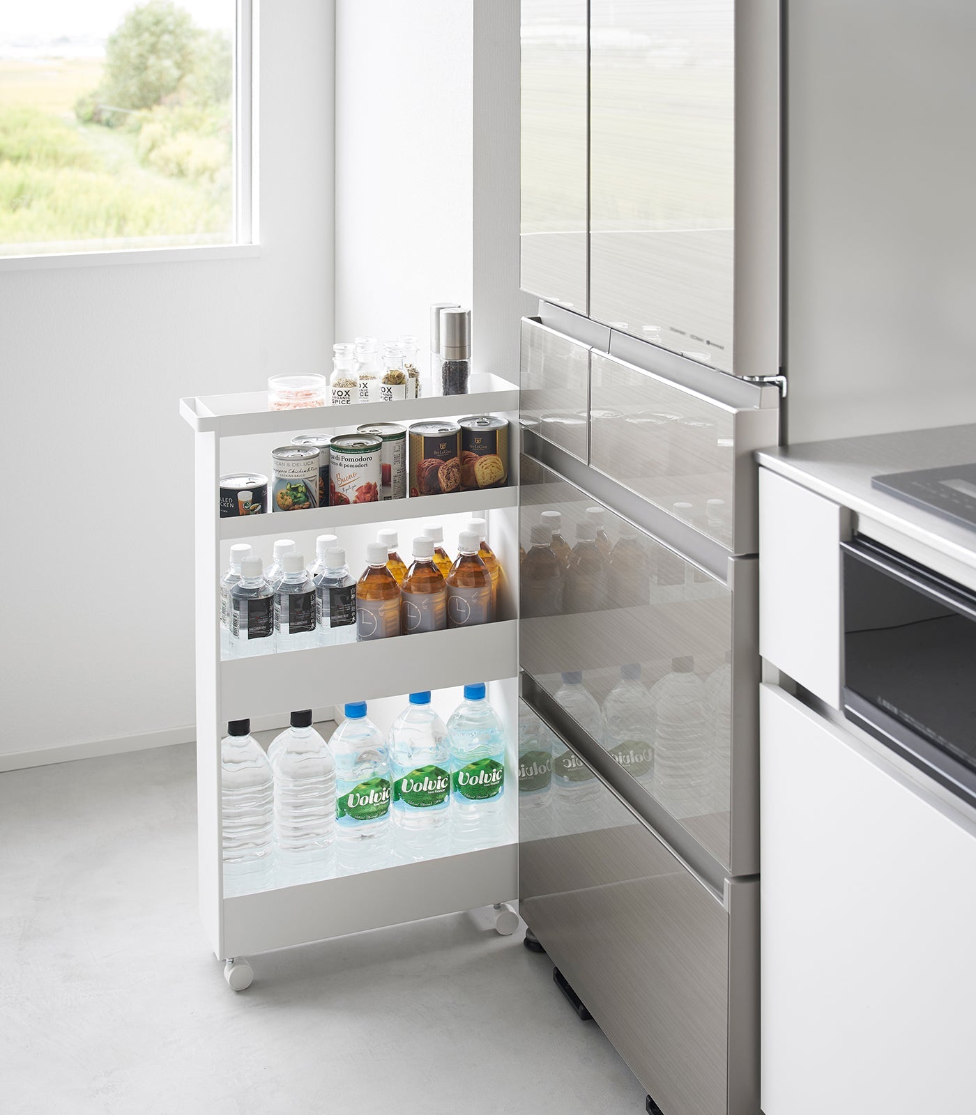 Sliding storage, wherever you need it. Keep this four-tiered rolling storage cart stocked with spices, accessories, cleaning supplies, miscellanious trinkets and more. Turn previously unusable space in your kitchen, bathroom, or living room into an ultra-accessible cabinet. Store heavy objects on the roomy bottom shelf and smaller items on top. Designed with handles and casters, this rack is easy to access, move, and clean. This simple storage solution makes organizing small spaces and large a breeze.