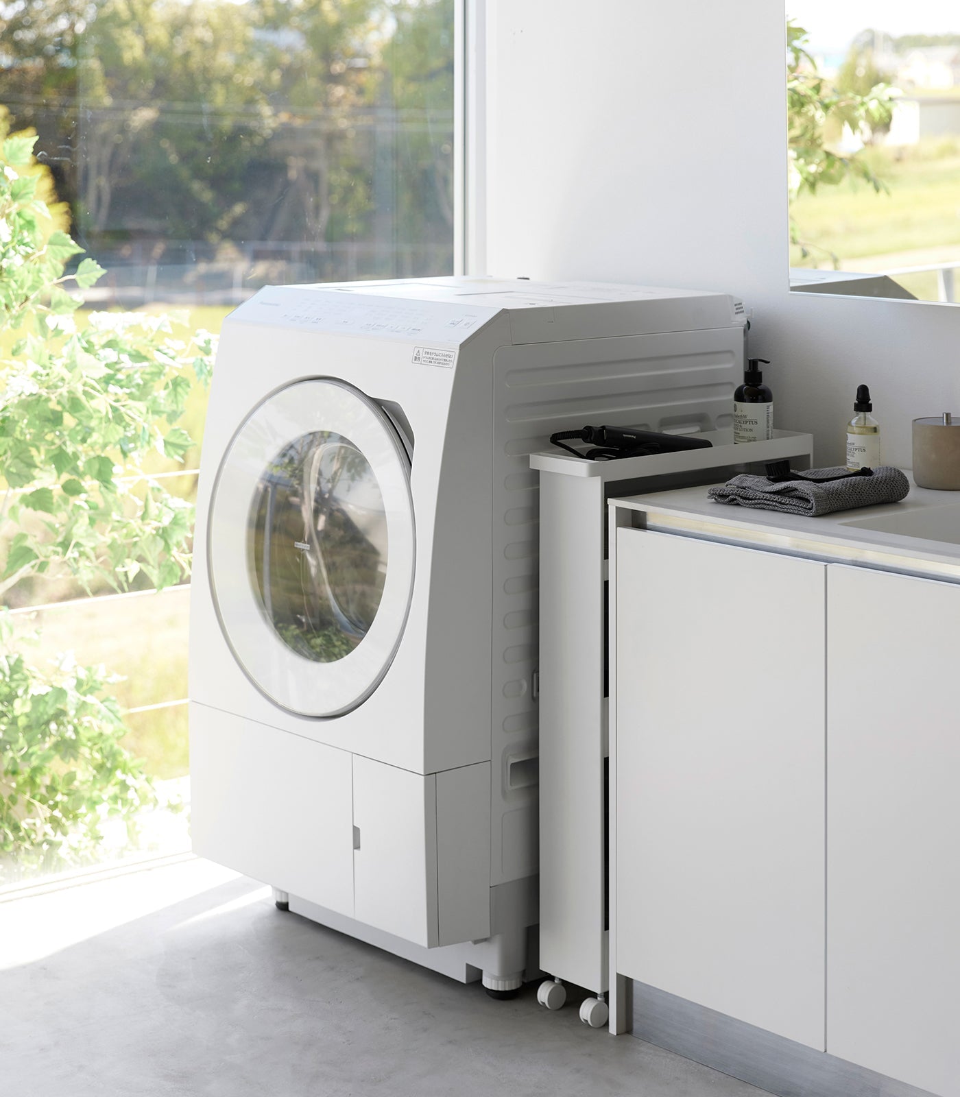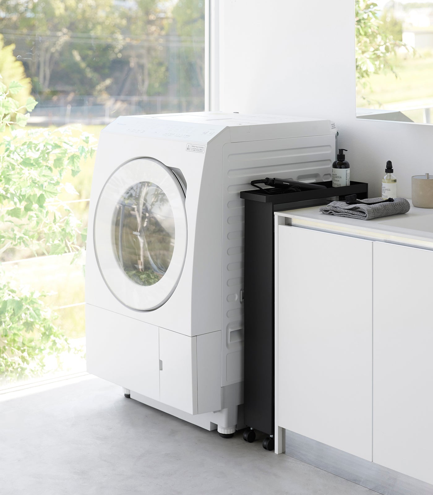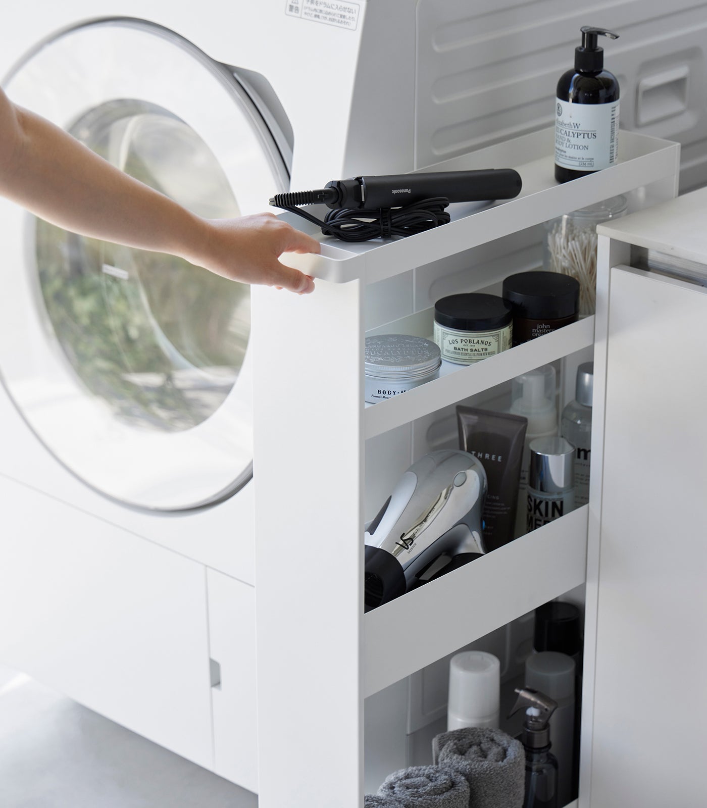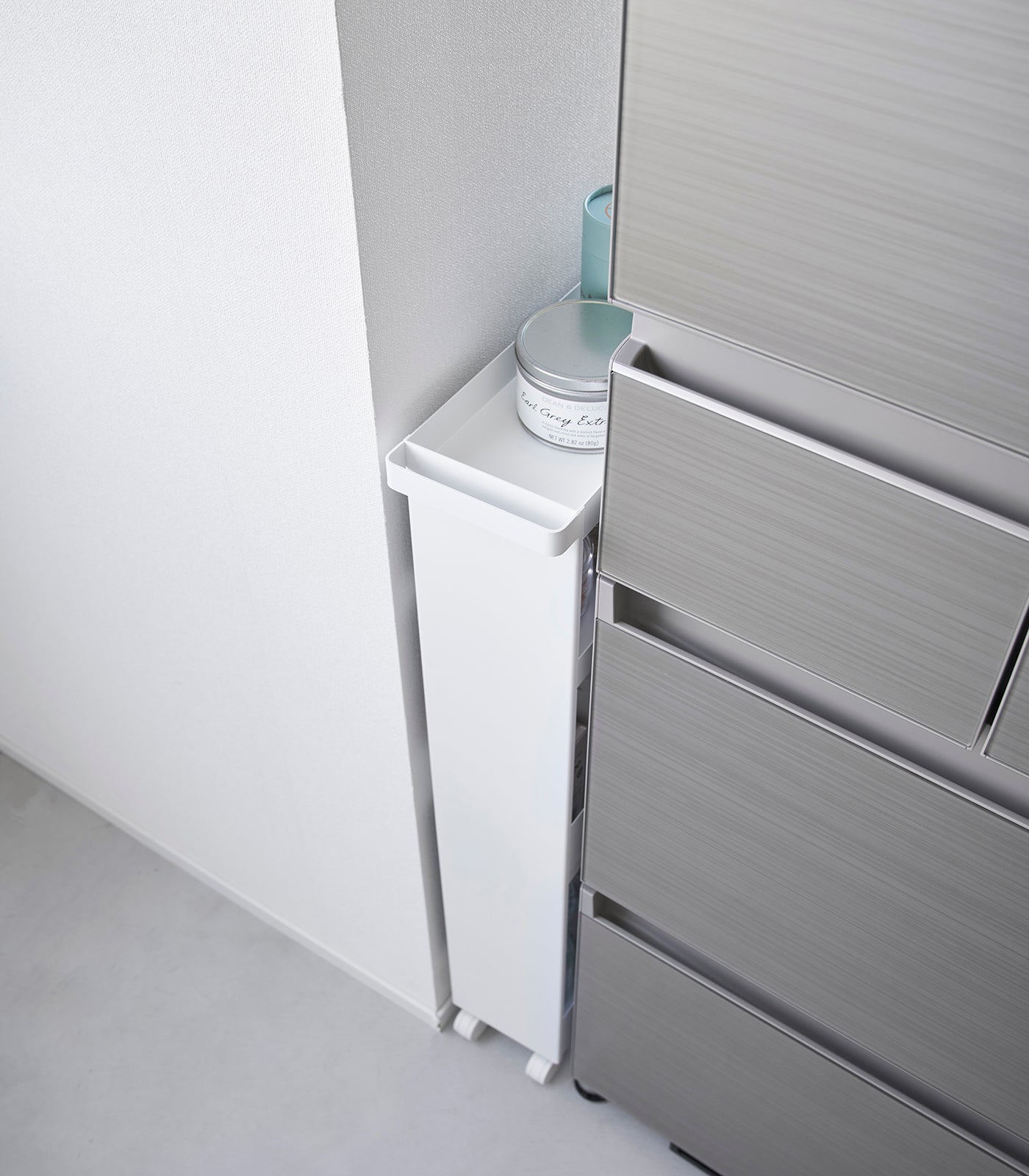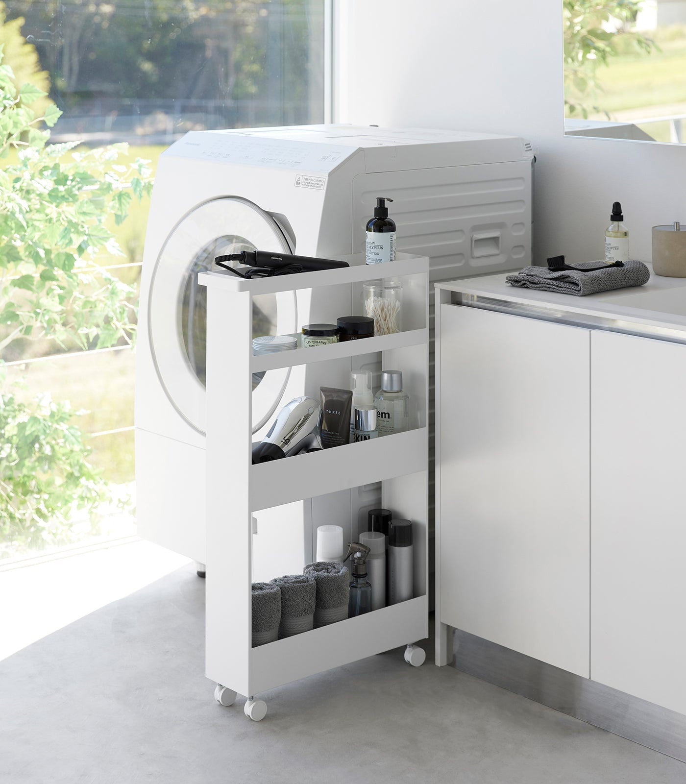 Sliding storage, wherever you need it. Keep this four-tiered rolling storage cart stocked with spices, accessories, cleaning supplies, miscellanious trinkets and more. Turn previously unusable space in your kitchen, bathroom, or living room into an ultra-accessible cabinet. Store heavy objects on the roomy bottom shelf and smaller items on top. Designed with handles and casters, this rack is easy to access, move, and clean. This simple storage solution makes organizing small spaces and large a breeze.