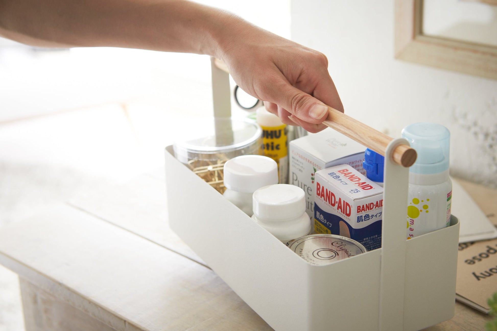 The caddy-lac of countertop organizers. Beautiful storage organizers that will have you admiring your countertops. These multipurpose steel totes with wooden handles are excellent ways to declutter and store smaller items around the home. Stylish enough to leave on your countertops and small enough to tuck away into cupboards. Small version also available.
