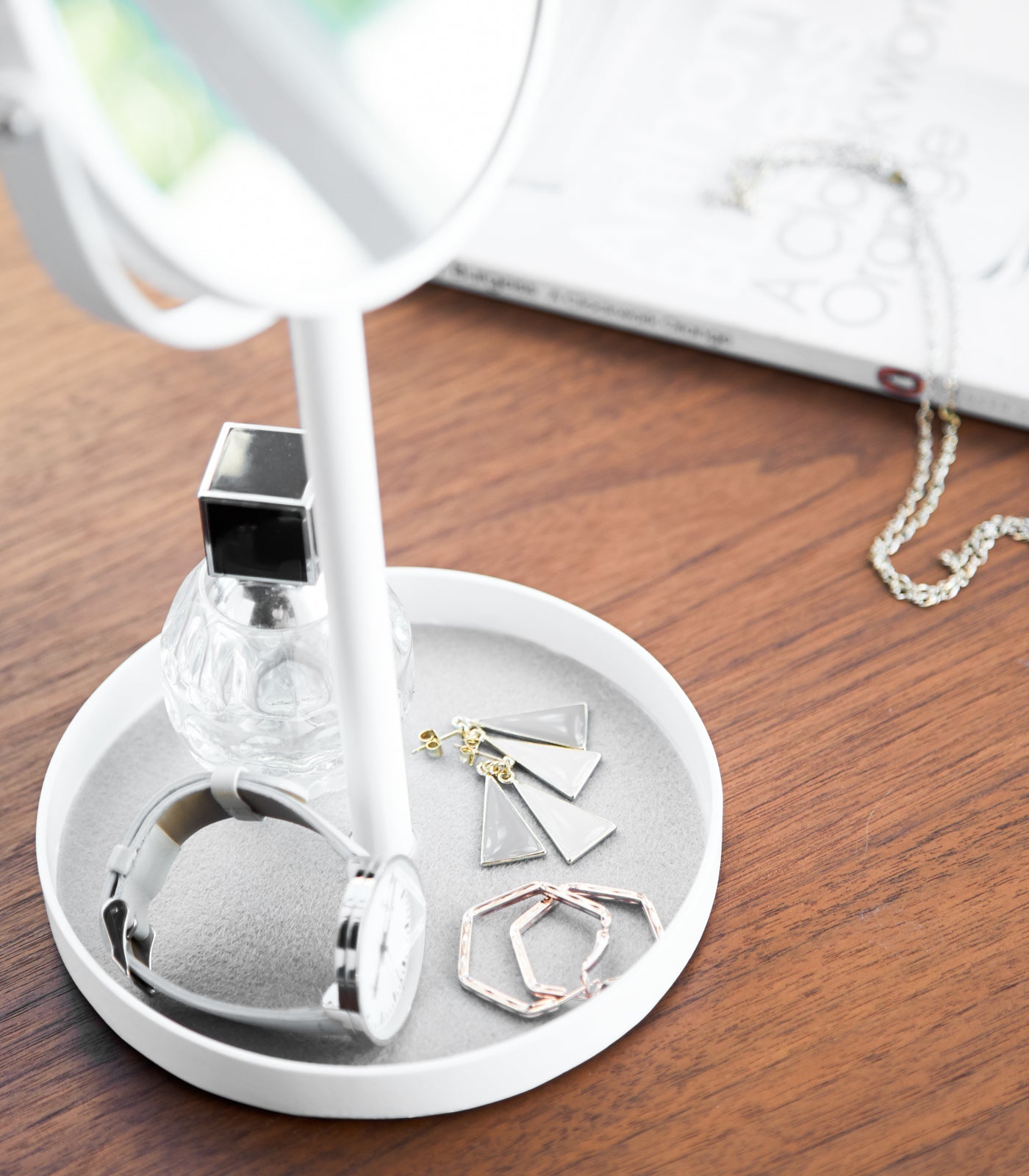 It’s a mirror-cle. Check out your look in the 360-degree mirror while getting ready. Not vibing with your earrings? Simply switch them out and store them in the bottom tray which is perfect for holding tiny trinkets.