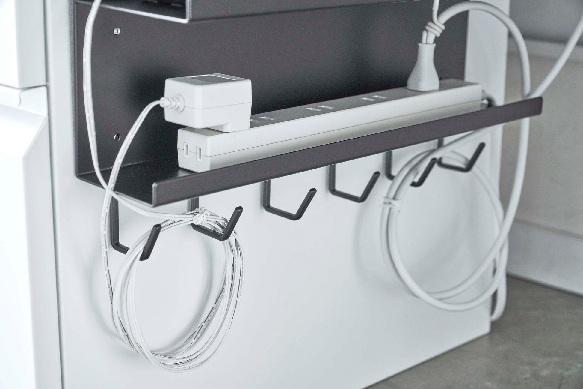 Make your cable situation *work*! Are you feeling tied up at your desk? Untangle yourself from the heap of cables and cords hiding under your workspace with this cable rack. It can be wall-mounted or magnet-mounted if you have a magnetic desk or surface nearby. Organize your router, power strip and excess cables in one go. Loop excess cords along the lower hooks so that they no longer drag along the floor where they can get rolled over by a chair—or worse!